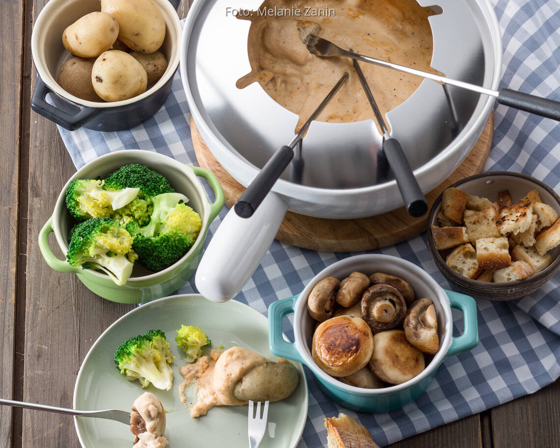Den Cashew-Fonduekäse im Fonduetopf langsam erhitzen und auf dem Rechaud bei schwacher Hitze köcheln lassen. Die Fonduezutaten auf Fonduegabeln durchziehen. Die Sauce immer mal wieder umrühren, damit nichts am Topfboden ansetzt.