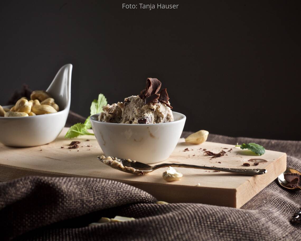 Das Ganze kann jetzt für etwa 20–25 Minuten in die Eismaschine gegeben werden. Nach und nach die Schokoladenstückchen dazugeben.