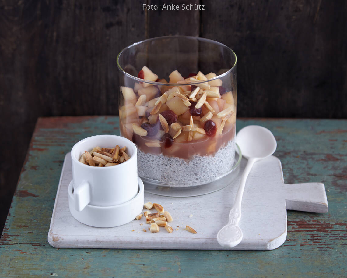 Im Sommer schmeckt der Chiapudding auch mit einem rohen Topping aus frischen Beeren, Aprikosen- oder Pfirsichstückchen.