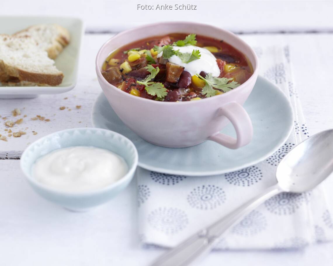 Inzwischen Bohnen und Mais in einem Sieb kalt abbrausen und gut abtropfen lassen. Zum Eintopf geben und bei milder Hitze ca. 5 Min. mitkochen. Den Koriander abbrausen, trocken schütteln und die Blätter abzupfen. Den Eintopf mit Salz, Pfeffer und Cayennepfeffer abschmecken, anrichten und mit je 1 Klecks Joghurt garnieren. Mit Koriandergrün bestreuen. Dazu passt Baguette.