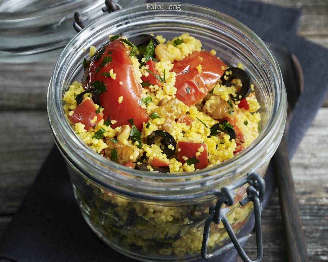 Das Olivenöl in einer Pfanne erhitzen. Knoblauch, Zwiebel, Paprika, Oliven, Walnüsse und Tomaten hinzugeben und 3 Min. anbraten. Die Brühe, den Couscous und das Kurkuma einstreuen und unter Rühren kurz aufkochen. Den Herd abstellen, die Pfanne abdecken und alles 10 Min. quellen lassen.