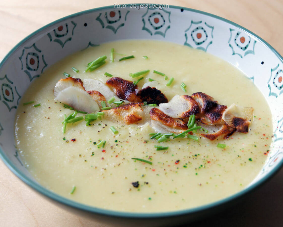 Foto: ab jetzt veganCremige Kartoffelsuppe mit knusprigen Schwarzwurzel-Chips