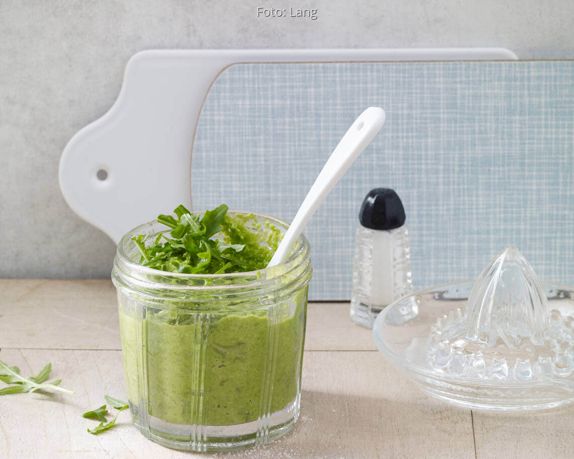 Rucola waschen und trocken schütteln. Grobe Stiele entfernen, die Blätter hacken und unter die Curry-Erbsencreme rühren. Den Aufstrich mit Salz und Cayennepfeffer abschmecken und vor dem Servieren möglichst 1 Std. durchziehen lassen.