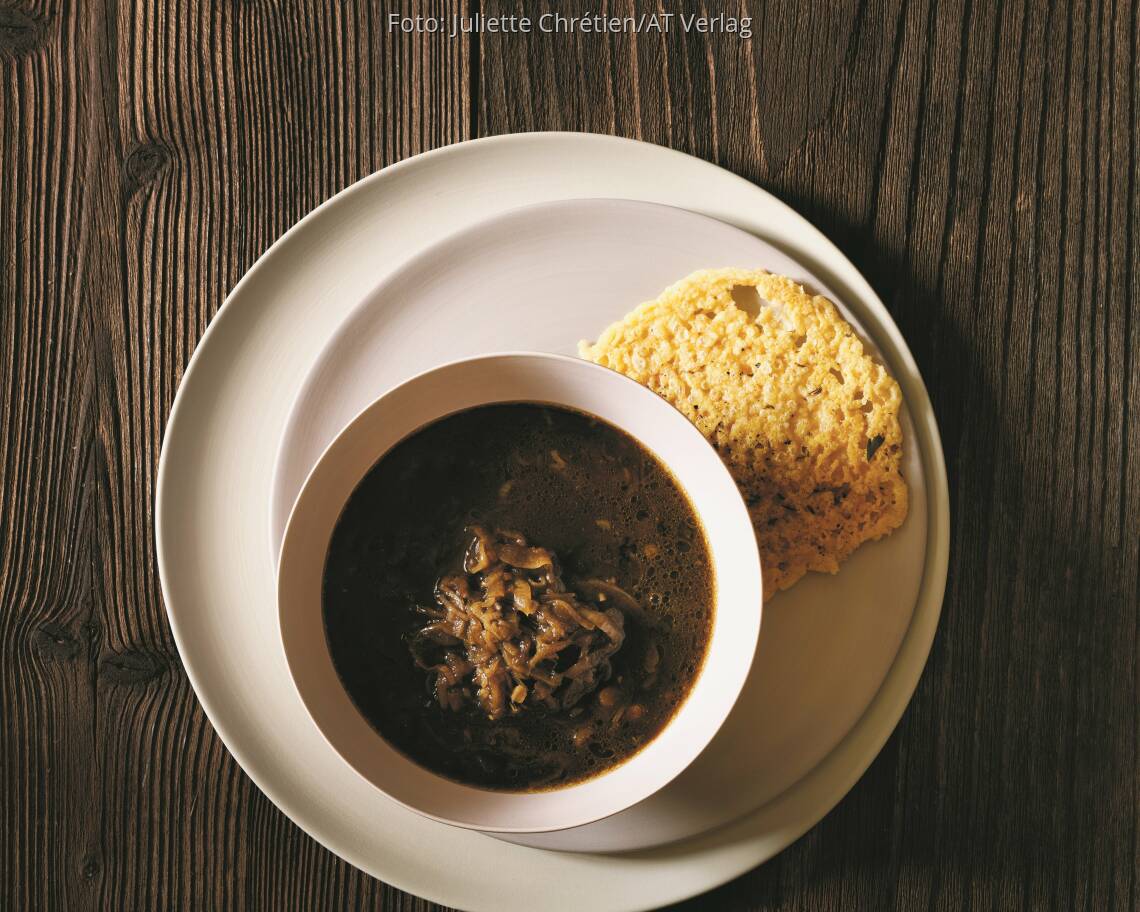 Foto: Juliette Chrétien/AT VerlagDunkles Bier-Zwiebel-Süppchen mit Käsechips