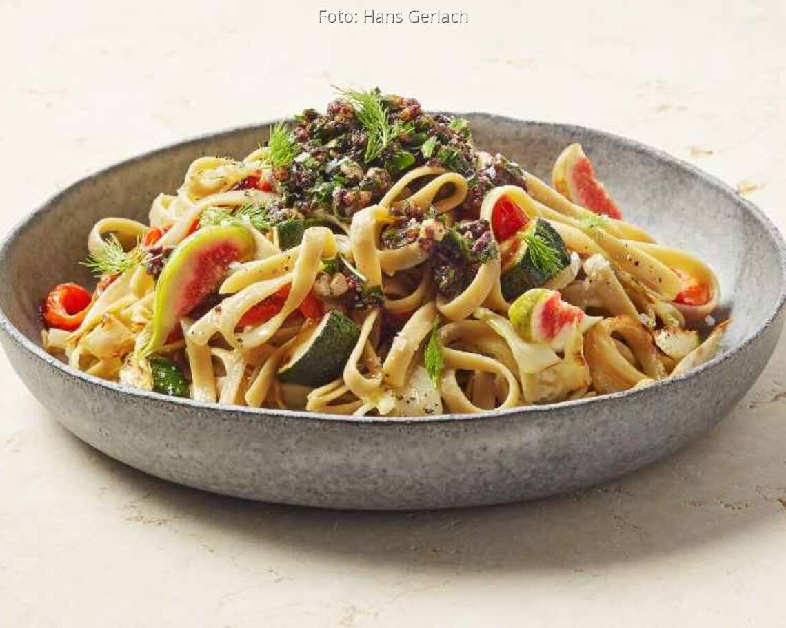 Foto: Hans GerlachEdamame-Fettuccine mit gebratenem Frühlingsgemüse und Feigentapenade