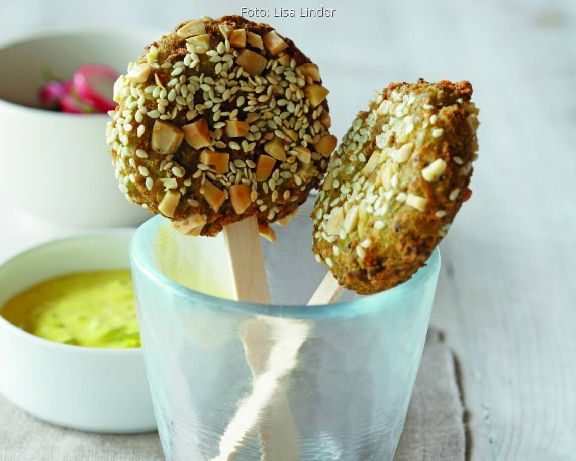 vegetarisches Rezept von Vicki EdgsonDiese leckeren Lollis haben es in sich: Käse, Sesamsamen, Kichererbsenmehl, Erbsen und der Joghurtdip liefern Proteine und verbinden sich zu einem vollen, würzig-frischen Aroma. Machen Sie eine große Menge von diesen Lollis, sie werden viel schneller verschwinden, als Sie dachten.