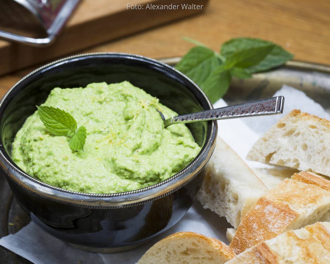 Die Erbsen mit der Frühlingszwiebel, dem Zitronensaft, der Sesampaste und dem Olivenöl fein pürieren. Mit Minze, Zitronenschale, Kreuzkümmel, Paprikapulver und Salz abschmecken. Fertig! Dazu schmeckt: ofenfrisches knuspriges Brot, aber auch Gemüsestifte, die man in das Hummus dippt.