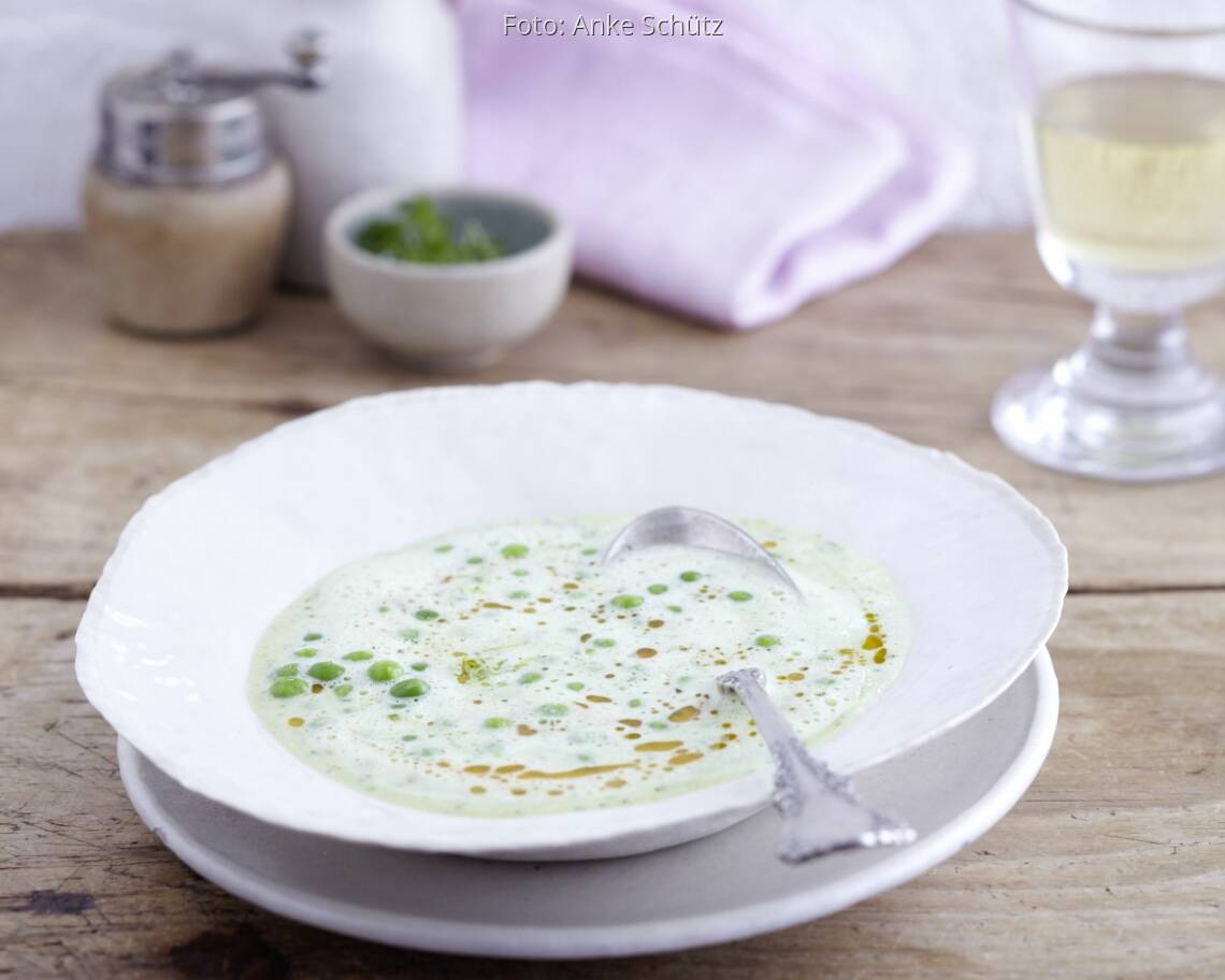 veganes Rezept von Martina KittlerDie sollten Sie sich genüsslich auf der Zunge zergehen lassen: Mandelmus, Sojasahne und Limette machen aus Tiefkühlerbsen eine sanfte, warme Cremesuppe mit Frische-Kick.