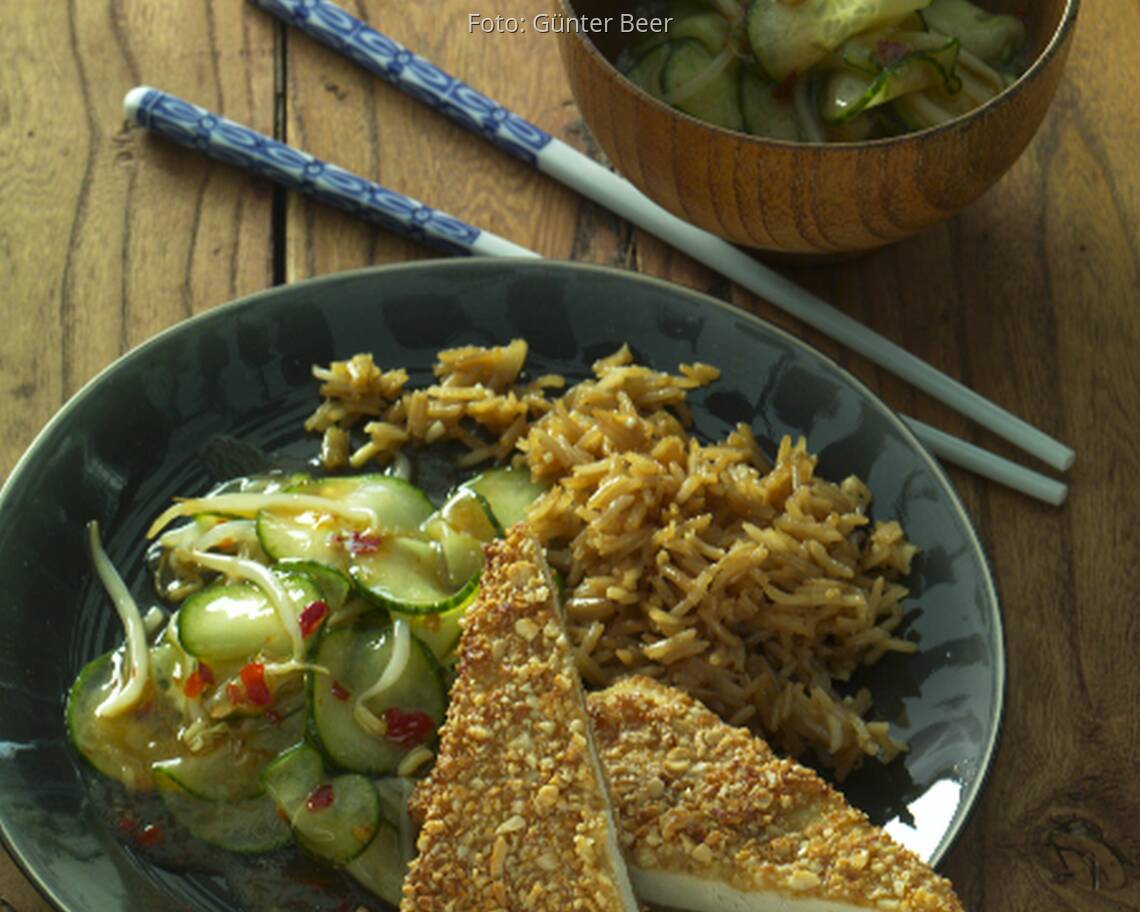 Foto: Günter BeerErdnuss-Tofuschnitzel mit Chili-Gurkensalat