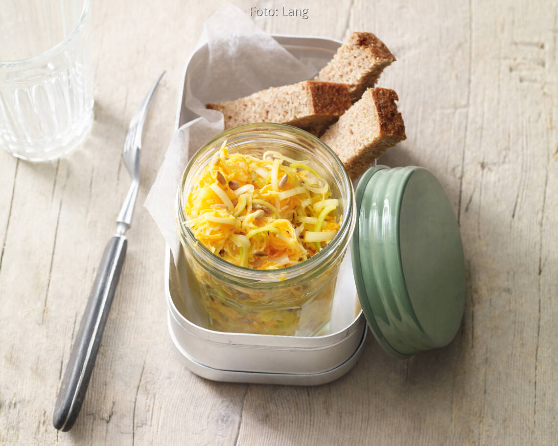 Für den Salat Sellerie und Möhre putzen, schälen und auf der Rohkostreibe mittelfein reiben. Den Lauch putzen, längs halbieren und gründlich waschen (auch zwischen den Blättern). Lauchhälften in sehr feine Halbringe schneiden. Das Gemüse mit dem Dressing mischen.