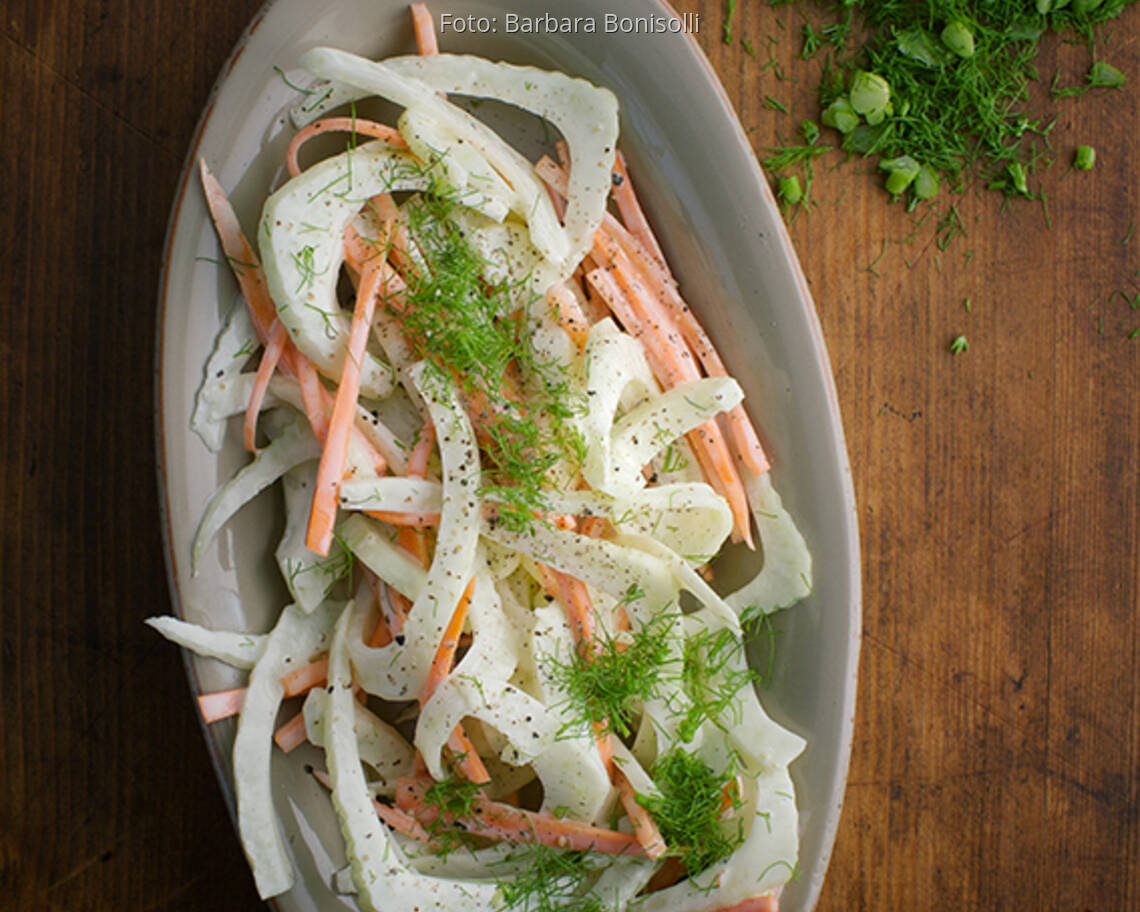 Die Fenchel-Möhren-Mischung mit dem Fenchelgrün und dem Dressing mischen. Dann den Salat ca. 30 Min. ziehen lassen.