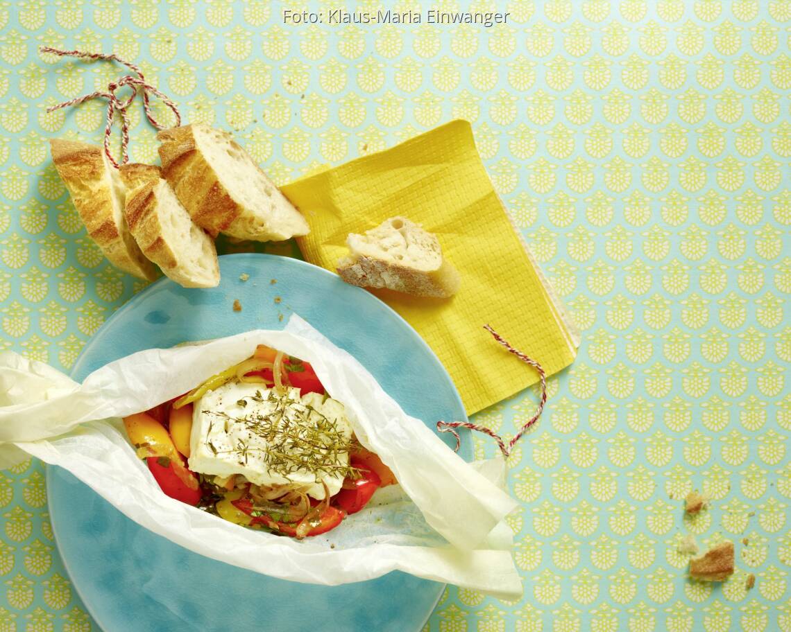 Das Papier über dem Käse zusammenfalten und gut verschließen, dabei die Enden wie bei einem Bonbon mit Küchengarn an den Seiten zubinden. Die Päckchen nebeneinander auf ein Backblech legen. Schafkäse und Gemüse im heißen Ofen (Mitte) ca. 20 Min. backen.