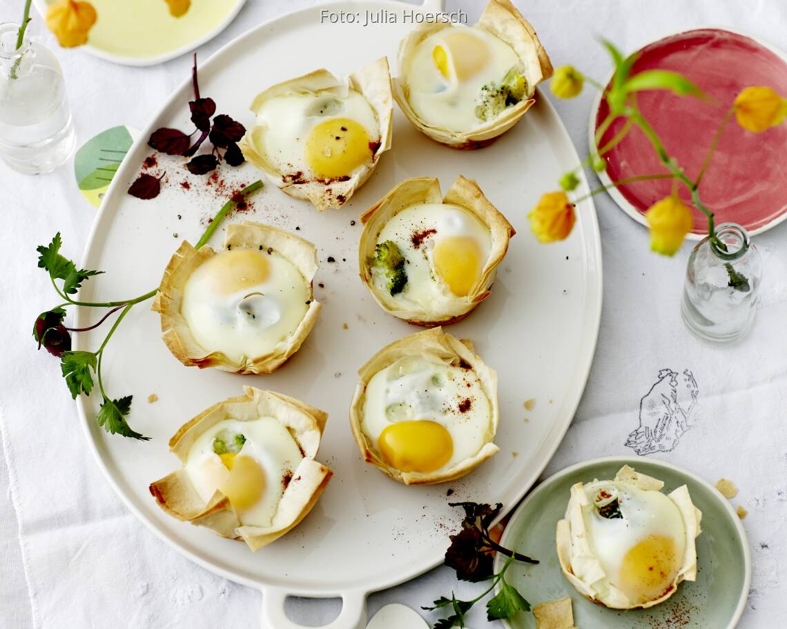 Die Brokkolimischung auf die Vertiefungen verteilen und jeweils in der Mitte eine leichte Mulde formen. Je 1 Ei aufschlagen und in die Mulde setzen, dabei darauf achten, dass das Eigelb ganz bleibt. Die Törtchen 25 Min. backen, dabei nach ca. 5 Min. bzw. sobald der Teig leicht gebräunt ist, einen Bogen Backpapier locker darüberlegen.