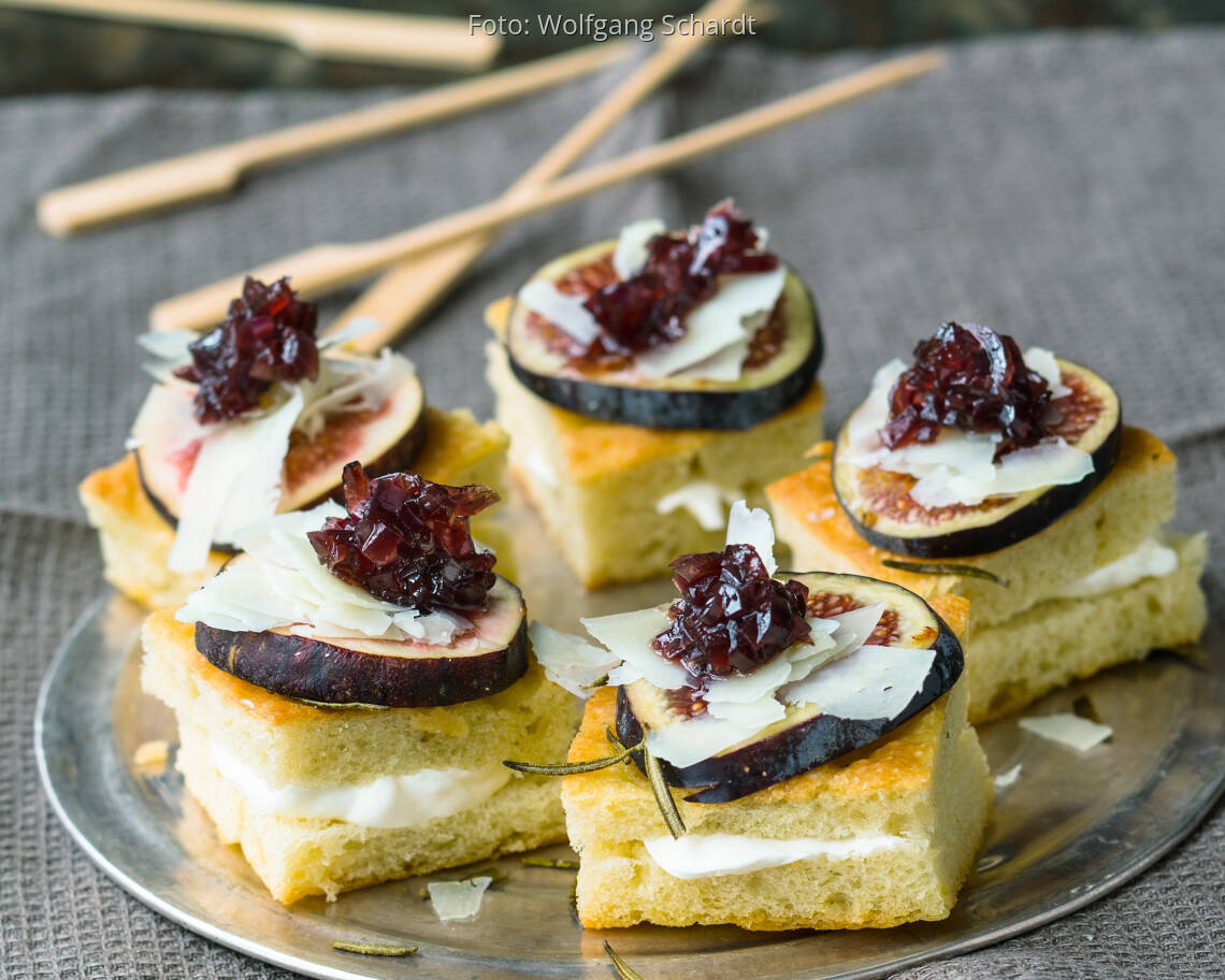 2 rote Zwiebeln schälen, fein würfeln und in 1 EL Olivenöl andünsten. 4 EL Zucker dazugeben und leicht karamellisieren lassen. 100 ml trockenen Rotwein und 4 EL Aceto balsamico angießen und alles etwa 8 Min. offen einkochen lassen, salzen und pfeffern. Abkühlen lassen. 4 Feigen waschen, entstielen und in je 6 Scheiben schneiden. 200 – 250 g Pecorino mit dem Gemüsehobel in grobe Späne hobeln. ½ Focaccia in 24 Quadrate (à 5 × 5 cm) schneiden und diese waagerecht durchschneiden. Unterseiten mit 150 g Frischkäse bestreichen und die oberen Hälften daraufsetzen. Dann mit Feige und Käse belegen. Zuletzt mit je 1 Klecks Rotwein-Balsamico-Zwiebeln garnieren.