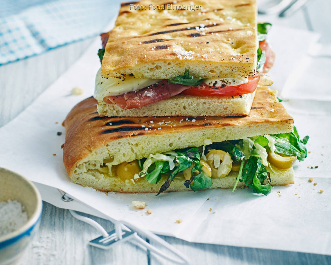 Den Grillrost heiß werden lassen, leicht ölen. Die gefüllten Focaccia-Sandwiches auf den Rost legen und bei mittlerer Hitze pro Seite 8 – 10 Min. grillen, bis der Fontina zu schmelzen beginnt. Dabei die Focaccia immer wieder mal mit einem Pfannenwender zusammendrücken. Heiß servieren.