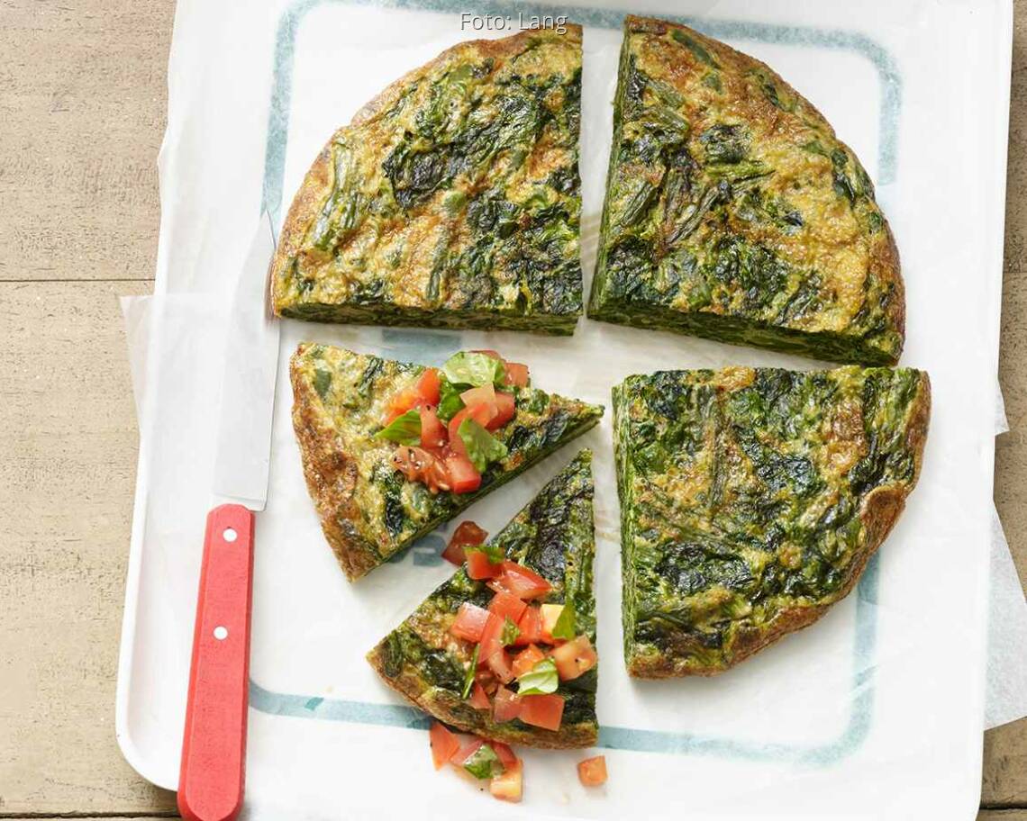 In einer beschichteten Pfanne Olivenöl erhitzen. Die Eier-Gemüse-Masse gleichmäßig darin verteilen. Bei mittlerer Hitze zugedeckt 5 – 7 Min. backen, bis die Unterseite knusprig gebräunt und die Oberseite fast gestockt ist.