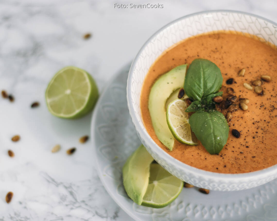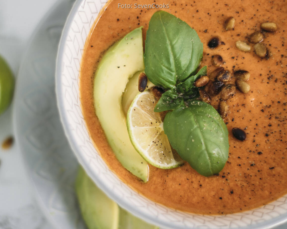 veganes Rezept von SevenCooks LunchtimeDiese herrliche Suppe ist ein echter Klassiker und alles was man wirklich an Küchengeräten dafür braucht ist ein Mixer! Sie wird kalt serviert und ist somit eine willkommene Abkühlung an heißen Sommertagen.