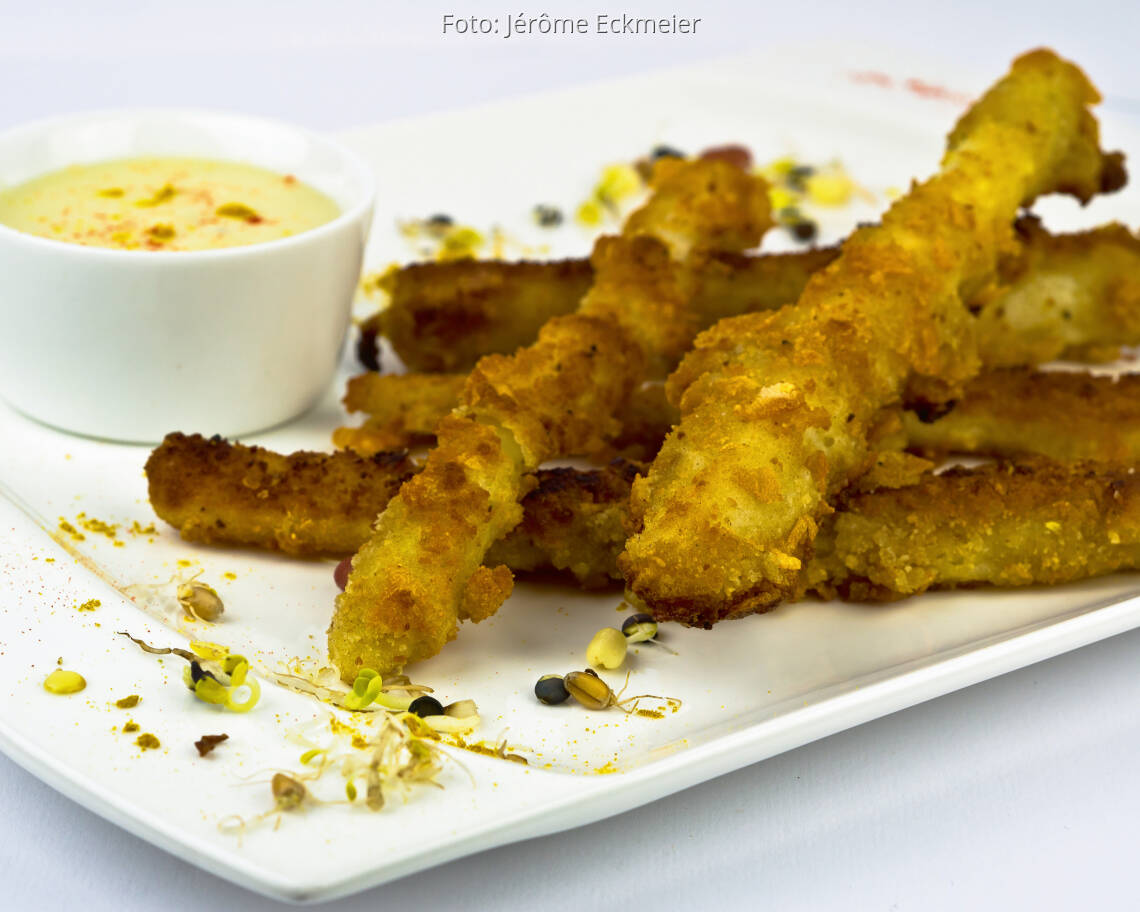 Foto: Jérôme EckmeierGebackener Spargel im Knuspermantel mit Knoblauch-Dip