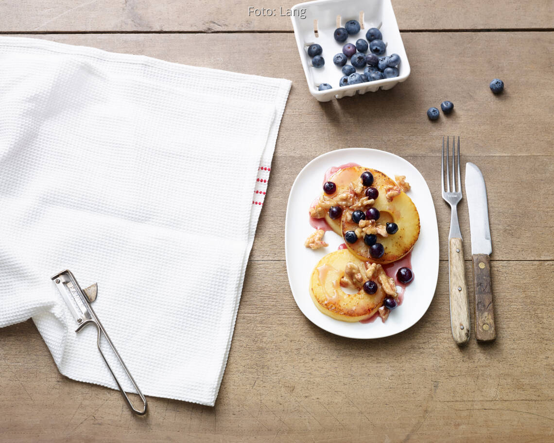 Die Apfelringe auf Teller verteilen. Die Heidelbeeren und Walnusskerne in die Pfanne geben und rühren, bis die Beeren lauwarm sind. Die Mischung auf den Äpfeln verteilen.