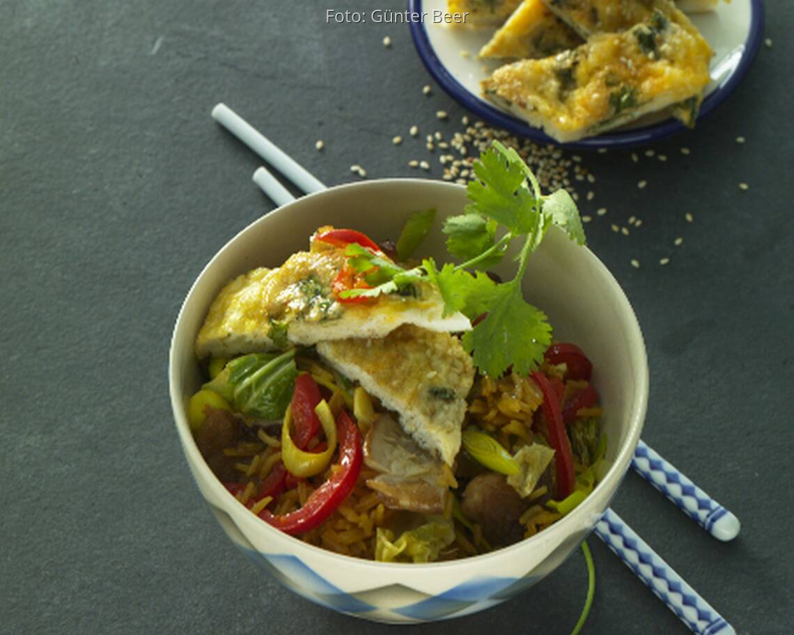 Foto: Günter BeerGebratener Gemüsereis mit Omelettstreifen