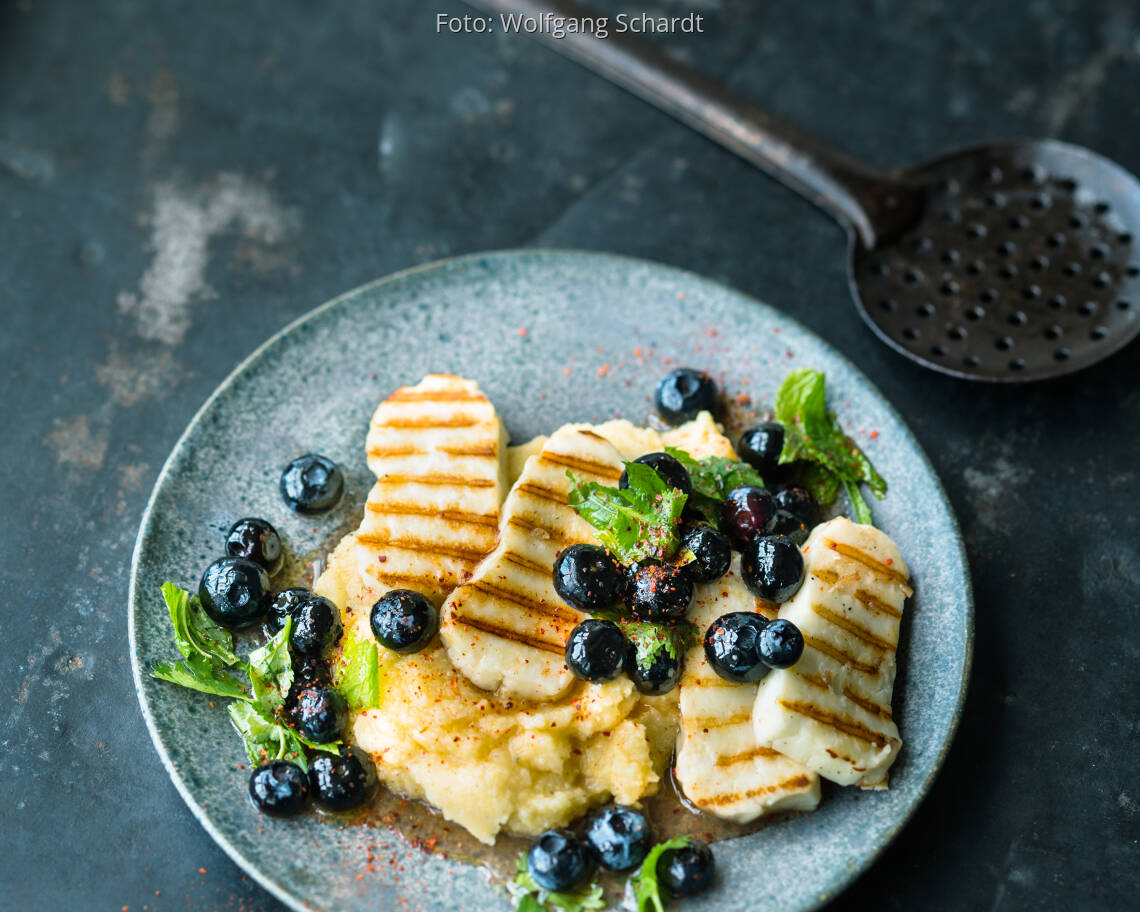 Die Polenta kräftig durchrühren und auf Tellern anrichten. Den Halloumi und die marinierten Heidelbeeren daraufgeben.
