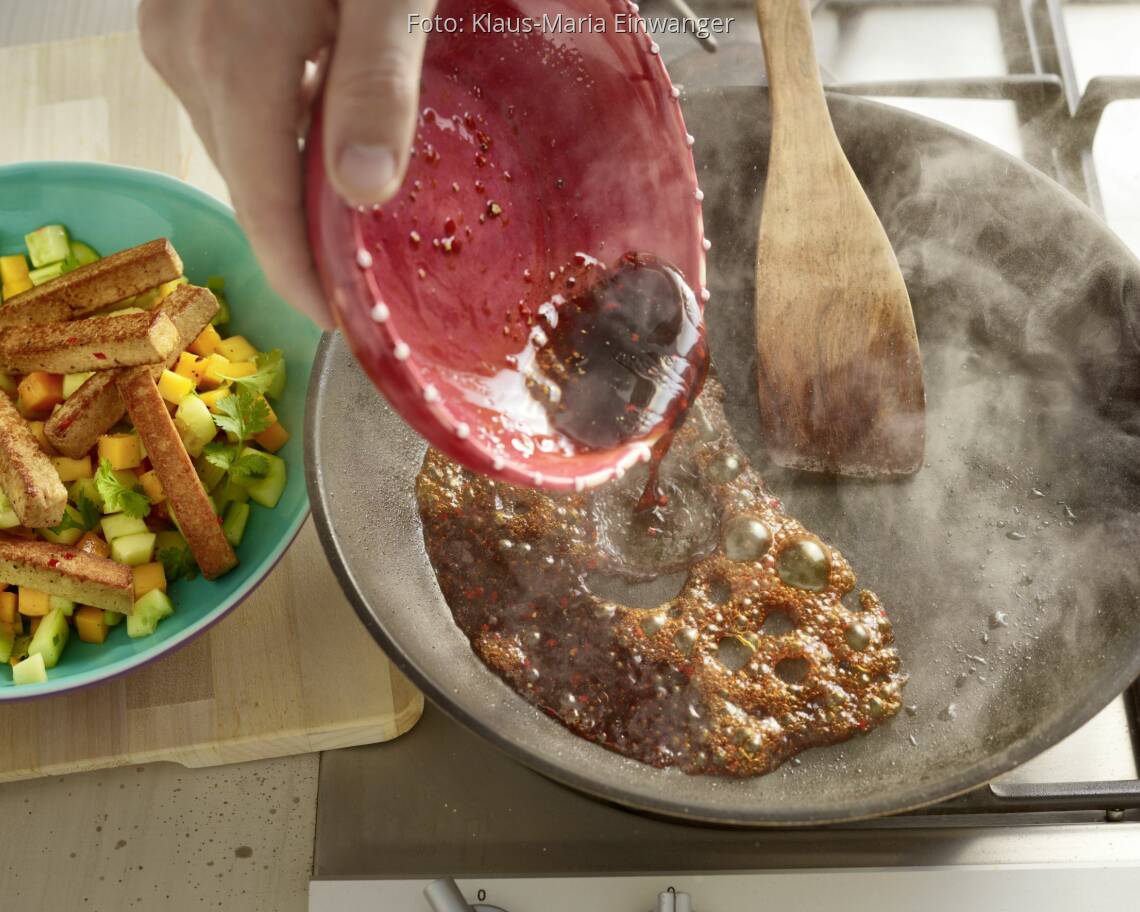 Tofu aus der Pfanne nehmen und auf dem Salat anrichten. Marinade in die Pfanne gießen, kurz einkochen lassen, dann über den Tofu träufeln. Salat sofort servieren.