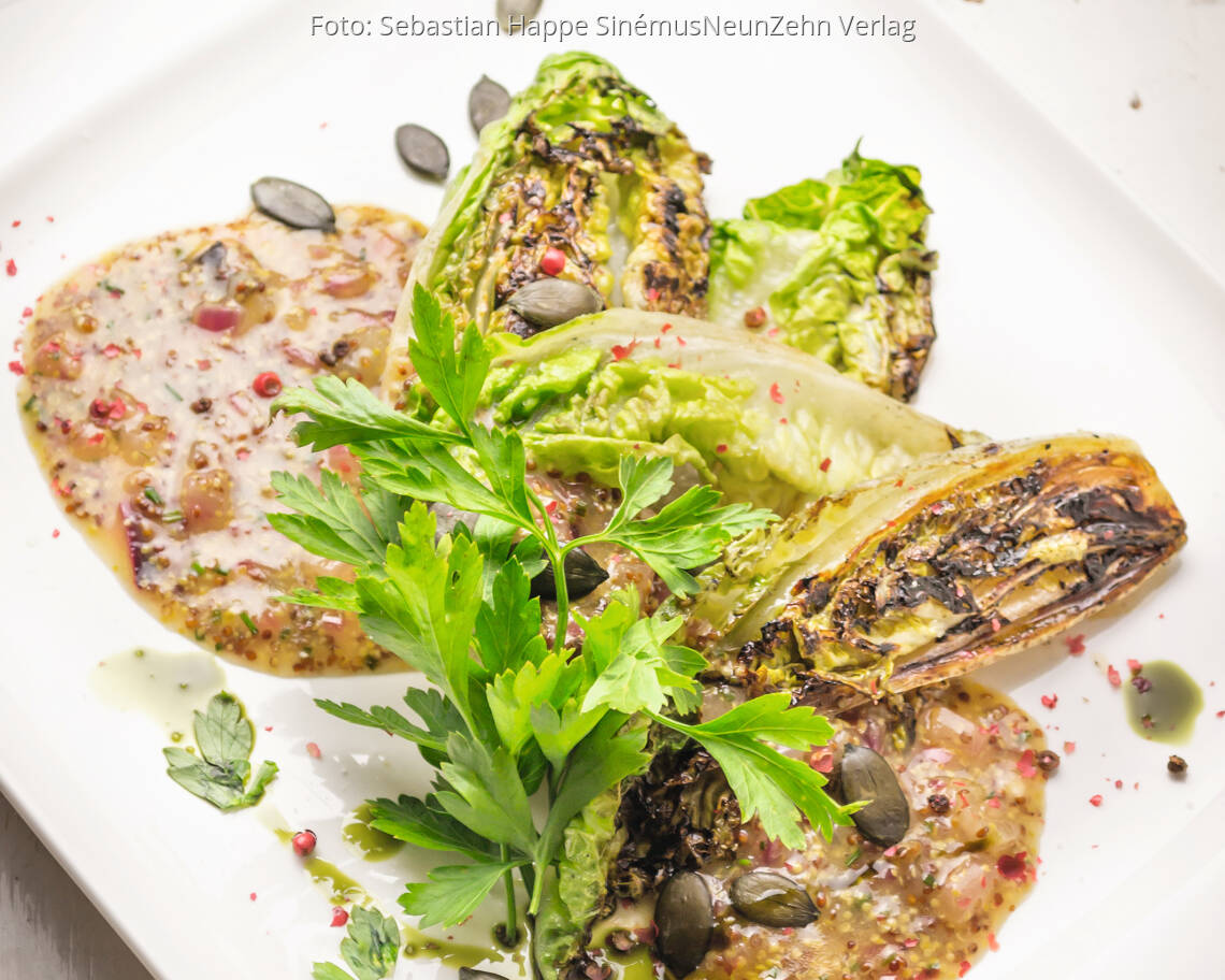 Den gegrillten Romana auf Tellern anrichten, jeweils etwas von dem Dressing darüber geben und mit den gerösteten Kürbiskernen und etwas rosa Pfeffer bestreuen.