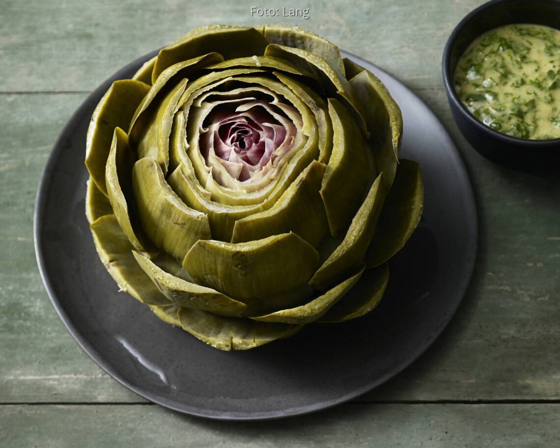 Foto: LangGekochte Artischocke mit Koriander-Senf-Dip