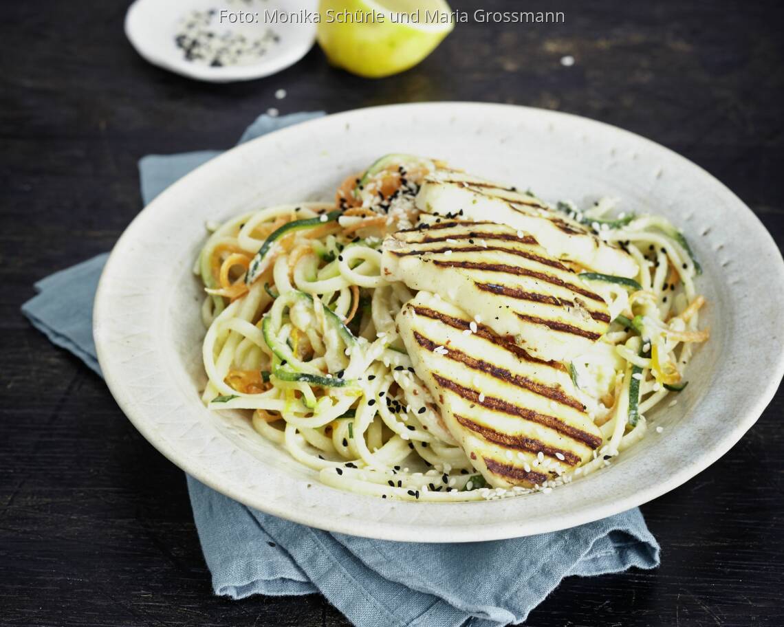 vegetarisches Rezept von Martina KittlerSuperschnell und extralecker: Pasta und gedünstete Möhren- und Zucchinistreifen in Zitronen-Sesamsauce. Dazu passt der pikant gewürzte Grillkäse perfekt.