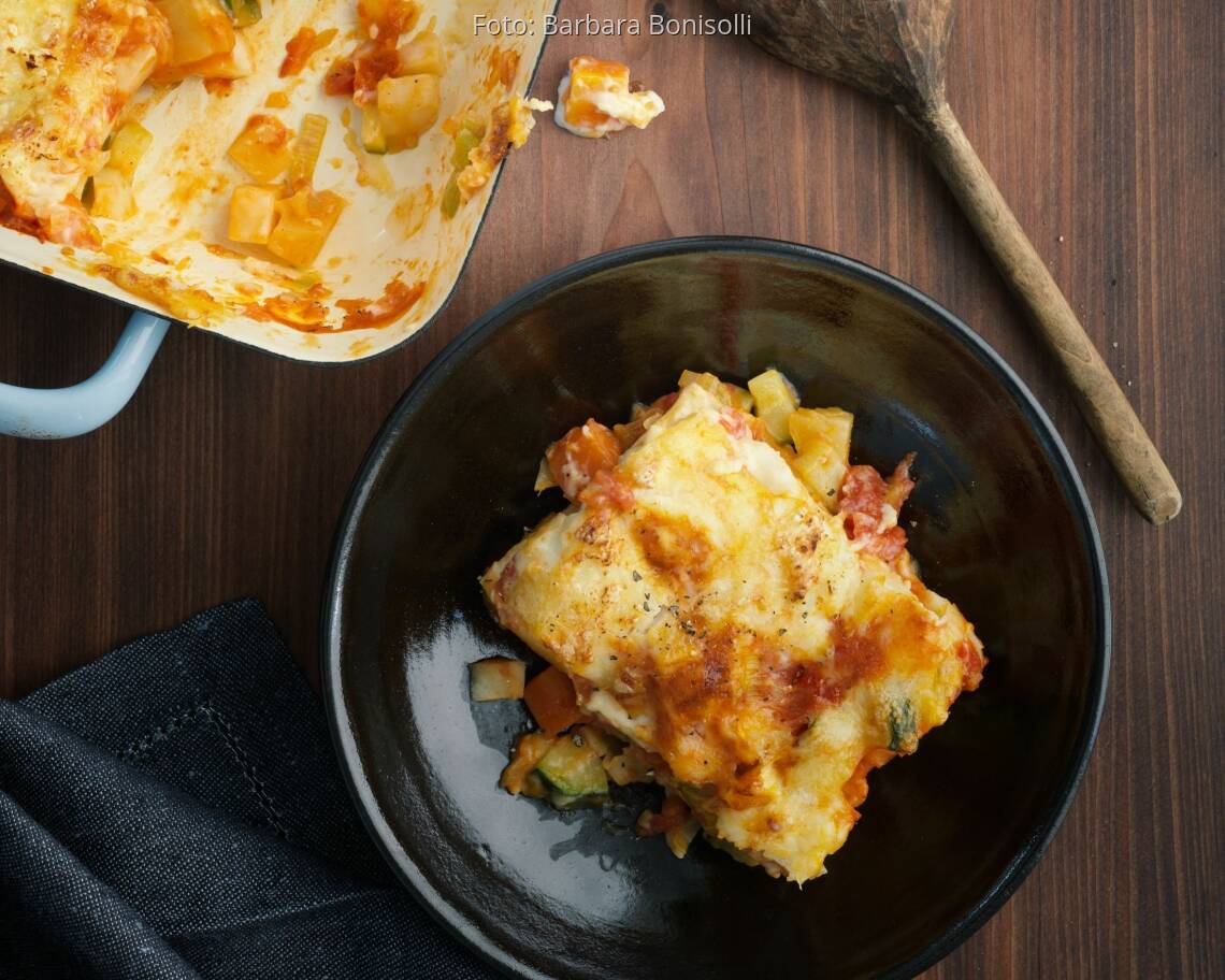 Den Backofen auf 200° vorheizen. Den Boden der Auflaufform mit der Sauce begießen und die Form abwechselnd mit den Nudelplatten, dem Gemüseragout und der Sauce füllen. Die dritte und letzte Lage mit dem Käse bedecken und die Lasagne im Ofen (Mitte) in 25 Min. goldbraun backen.