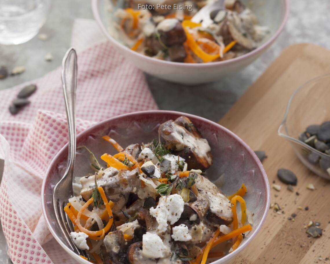 vegetarisches Rezept von Inga PfannebeckerStatt Tagliatelle schmiegen sich hier feine Möhren- und Pastinakenstreifen an die cremige Sauce. Pilze und Kürbiskerne sorgen für Biss und liefern Eiweiß.