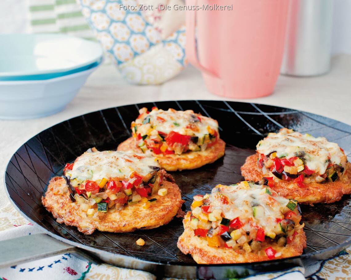 Gemüse etwas abtropfen lassen, dabei den Sud auffangen (kann für ein anderes Rezept verwendet werden). Gemüse auf die Puffer verteilen. Zottarella Rolle abtropfen lassen, in Scheiben schneiden und die Puffer damit belegen. Im Backofen ca. 10 Min. überbacken.