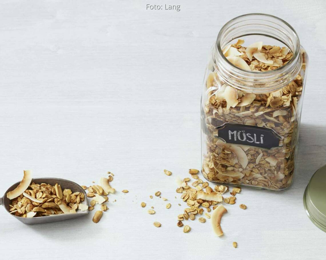 Das ausgekühlte Müsli in ein Twist-off-Glas oder eine Plastikbox füllen, gut verschließen und bis zur Verwendung an einem dunklen, kühlen Ort aufbewahren. Haltbarkeit: mind. 1 Monat. Mit Sojajoghurt oder Sojamilch servieren.