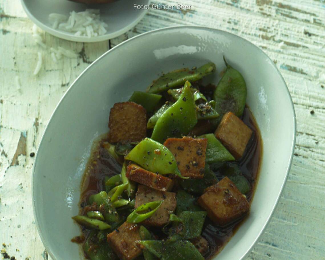 Foto: Günter BeerGeschmorter Tofu mit Frühlingszwiebeln