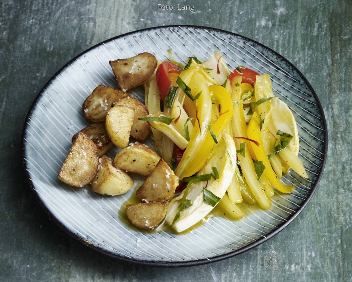Den Chicorée waschen und in einzelne Blätter zerlegen (den Strunk wegwerfen). Die Chicoréeblätter zum Fenchelgemüse geben. Das Gemüse mit den Röstkartoffeln servieren.