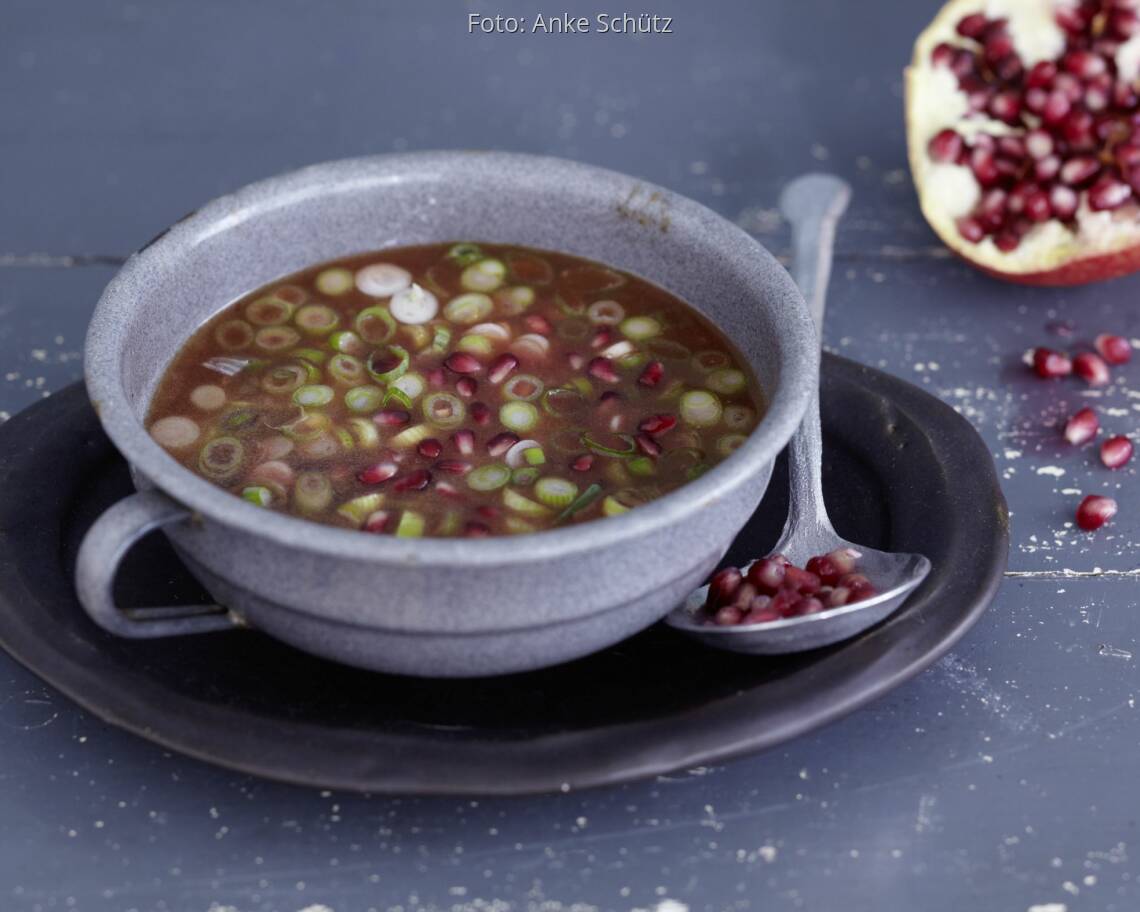 Den Granatapfel quer halbieren. Aus einer Hälfte 1 EL schöne Granatapfelkerne herauslösen und beiseitestellen, dann beide Hälften vorsichtig mit der Zitruspresse auspressen. (Achtung: Das spritzt und kann auf hellen Arbeitsplatten Flecken geben! Wer einen Entsafter hat, kann auch die äußere dicke Haut von beiden Granatapfelhälften abziehen und die Kerne samt Trennhäuten entsaften, das geht einfach und schnell.) Es werden insgesamt 150 ml Saft benötigt.