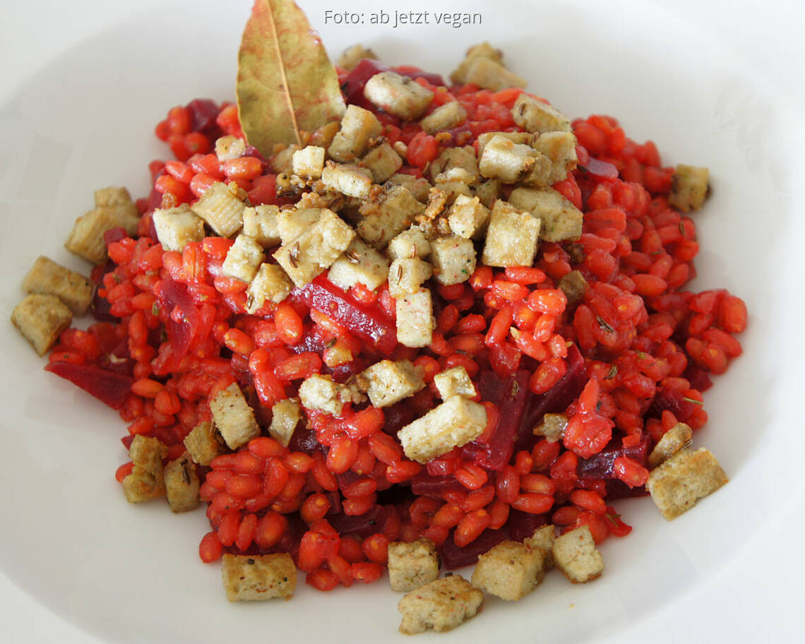 Foto: ab jetzt veganGraupenrisotto mit Roter Bete und mariniertem Tofu