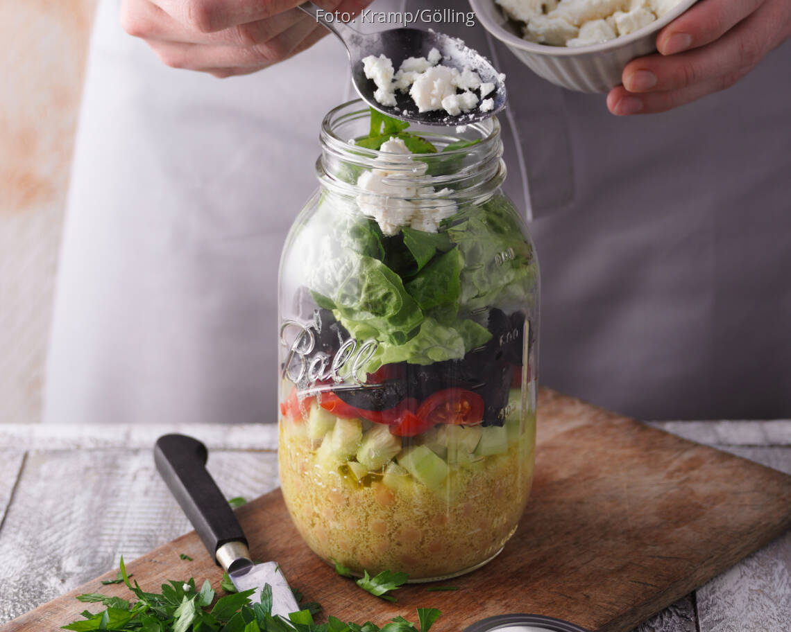 Die Kichererbsen in ein Sieb abgießen, kalt abbrausen und gut abtropfen lassen. Diese feste Zutat als erstes nach der Vinaigrette in das Glas geben.