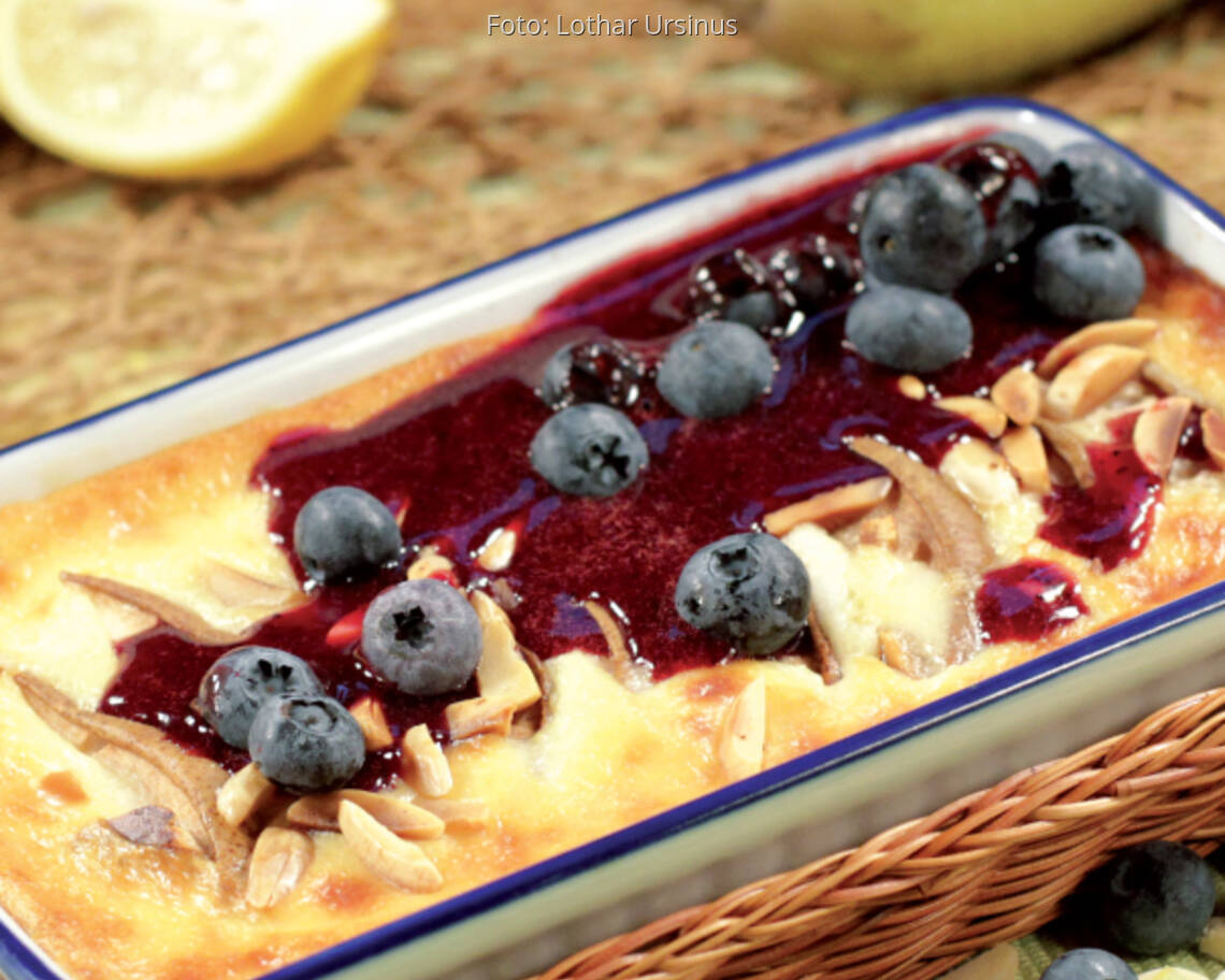 Den fertigen Grießauflauf noch warm mit der Blaubeersauce servieren.