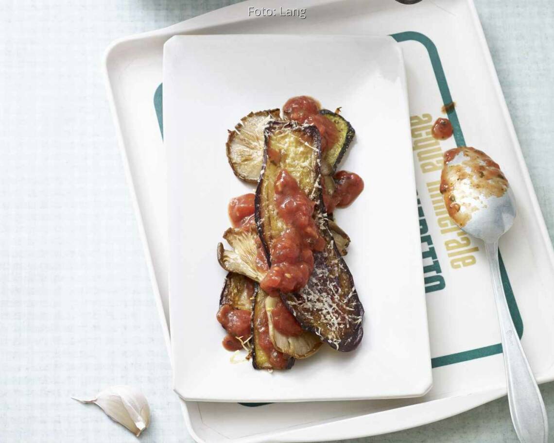 Auf Teller abwechselnd Aubergine und Zucchino übereinanderschichten. Dabei darauf achten, dass in jeder Schicht ein mit Käse überbackenes Stück liegt. Auf jede zweite Schicht zusätzlich Pilze geben und zwischen jede Schicht Tomatensauce träufeln. Voilà, fertig ist die nudellose Lasagne!