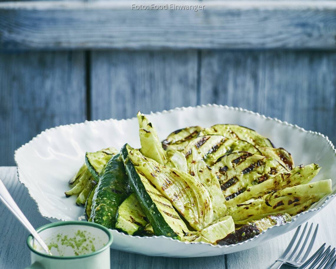Den Grillrost heiß werden lassen, leicht ölen. Das Gemüse auf den Rost legen und bei starker Hitze pro Seite 7–10 Min. grillen, bis es schön gebräunt ist. Grillgemüse anrichten und mit der restlichen Zitronensauce beträufeln.