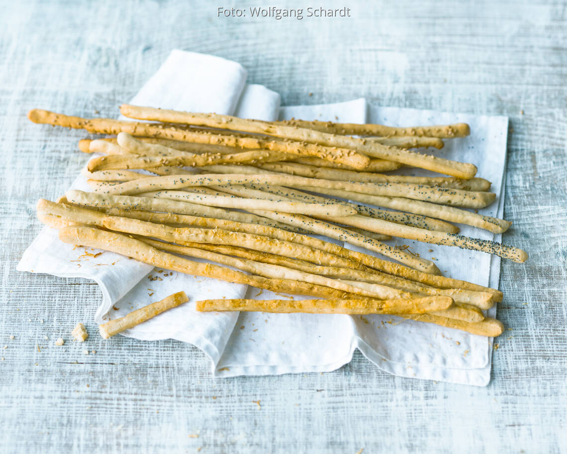 vegetarisches Rezept von Martin KintrupKrosse Knabberei. Warum Grissini nicht einmal selber backen? Das kostet Zeit, ist aber ganz einfach. Antipasti, Tapas und Mezze werden so zum doppelten Genuss!