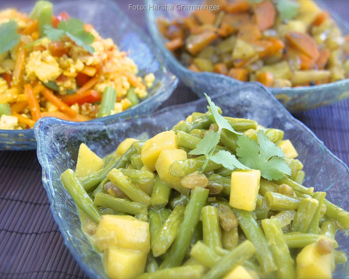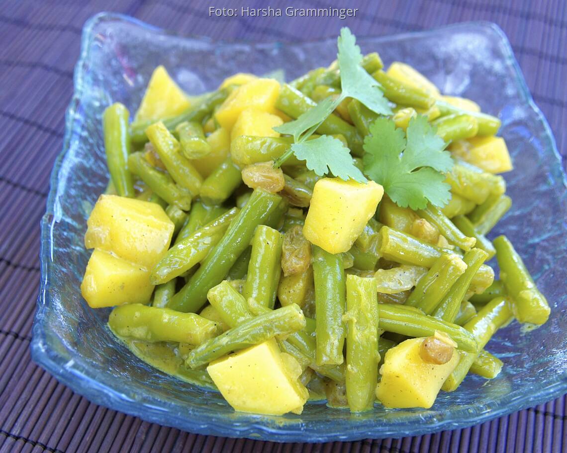 vegetarisches Rezept von Harsha GrammingerGrüne Bohnen in Kokossauce wirkt Vata neutral – Pitta beruhigend ↓ – Kapha verstärkend ↑