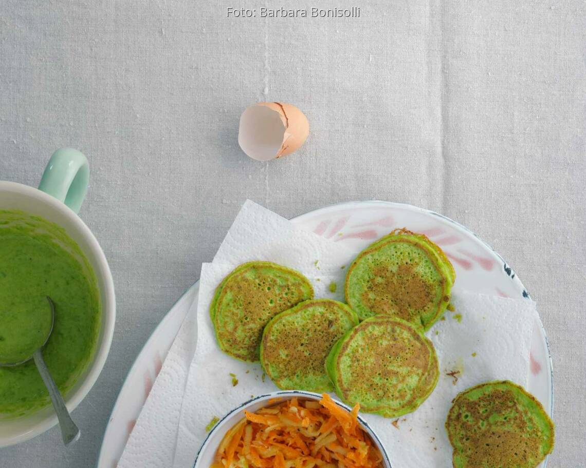 Öl in einer beschichteten Pfanne erhitzen. Pro Pancake 1 gehäuften EL Teig in die Pfanne geben und flach streichen. Pro Seite 2–3 Min. braten, auf Küchenpapier legen. Im restlichen Öl nach und nach 16–20 Pancakes backen. Mit Möhrensalat und Quark servieren.