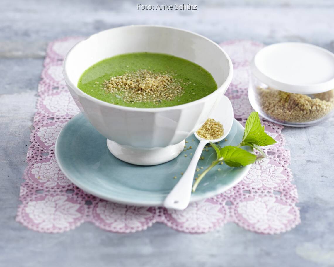 Quinoa mit Küchenpapier möglichst trocken tupfen. Rapsöl in einer Pfanne erhitzen. Die Quinoa darin unter gelegentlichem Wenden in 5–10 Min. knusprig braten und leicht mit Salz würzen. Quinoa abkühlen lassen und in ein Schraubglas geben. Die Suppe nach Belieben gut gekühlt oder aufgewärmt anrichten, mit Knusper-Quinoa bestreuen und servieren.