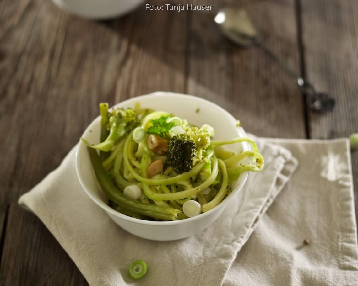 Die Zucchini waschen, schälen und mit einem Spiralschneider Spaghetti daraus schneiden. Den Brokkoli waschen und in kleine Röschen teilen. Die Bohnen ebenfalls waschen und die Enden abschneiden. Brokkoli leicht andünsten, die Bohnen in Salzwasser kochen.