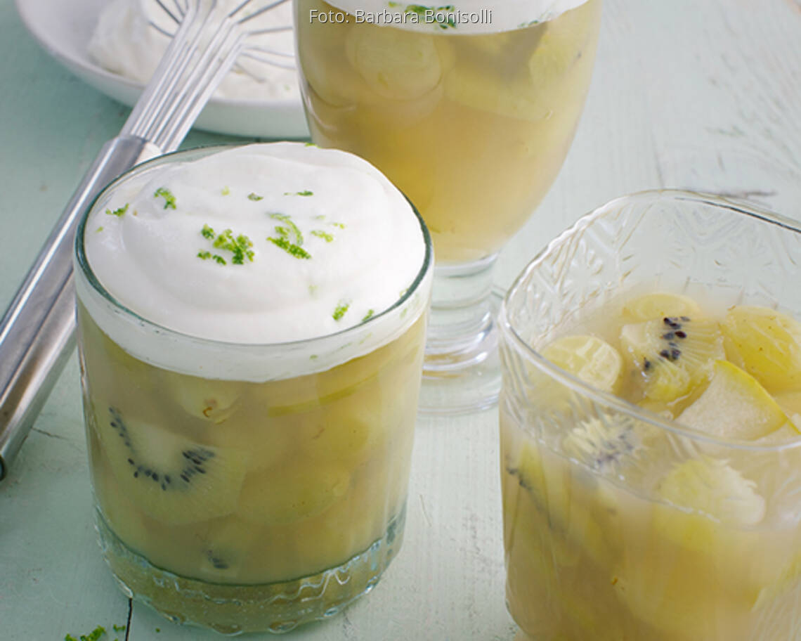 Trauben- und Limettensaft, mit Zucker und Agar-Agar in einem Topf aufkochen, Apfel dazugeben und ca. 5 Min. köcheln lassen. Kiwi und Trauben dazugeben und untermischen. In Dessertschalen füllen und im Kühlschrank in ca. 2 Std. erstarren lassen.