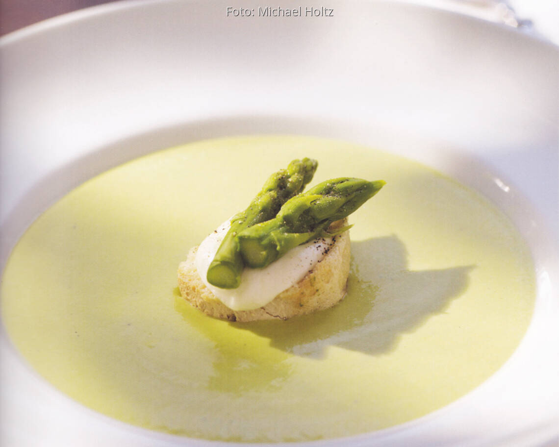 Foto: Michael HoltzGrüne Spargelcremesuppe mit Mozzarella-Spargel-Crostini
