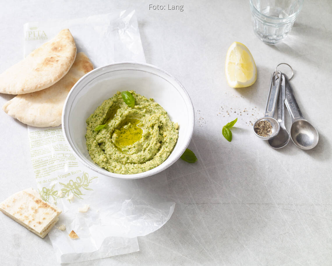 Kräuter und Frühlingszwiebeln mit Kichererbsen, Zitronensaft, Tahin und Öl in einen hohen Rührbecher geben und alles mit dem Pürierstab pürieren. Das Hummus mit Salz und Pfeffer abschmecken und vor dem Servieren möglichst 1 Std. durchziehen lassen.