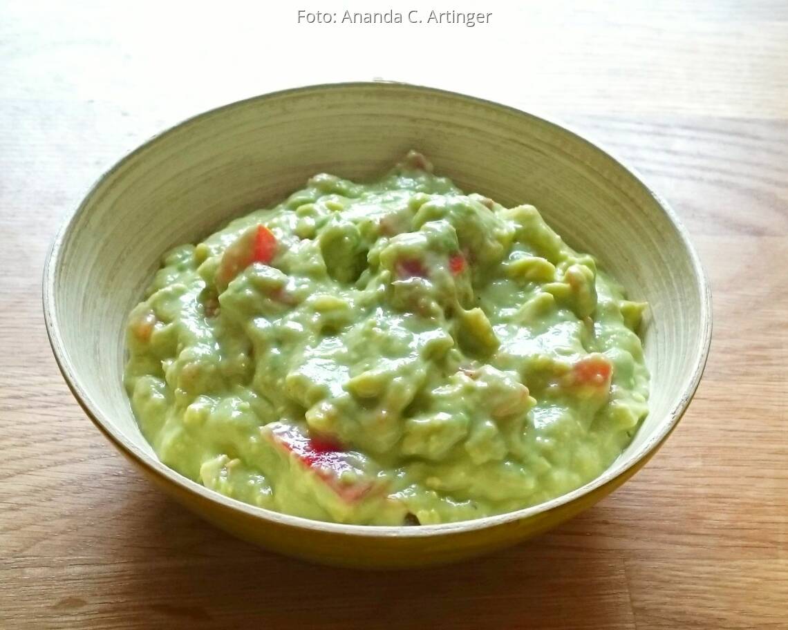Tomaten klein würfeln, Knoblauch mit einer Knoblauchpresse zerkleinern, dann beides zusammen mit dem Sojajoghurt in die Avocadomasse geben und gut verrühren.